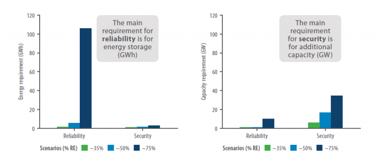 Energy security requires higher overall storage power capacity (measured as GW) than required purely for energy reliability, but the latter requires considerably more stored energy (GWh), as shown in Figure 1, particularly for high RE penetration levels. This is because for energy security purposes the electricity supplied is typically only required for very short periods (seconds or minutes), while for energy reliability the energy is needed for balancing supply and demand over several hours to meet peak loads.