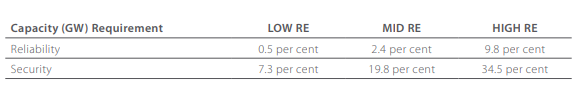The requirements for energy reliability and security are calculated separately and have not been optimised. Therefore, the total energy storage required as a proportion of total capacity, especially in the high renewable energy scenario, would be less than the sum of requirement for the individual requirements for energy reliability and for energy security.